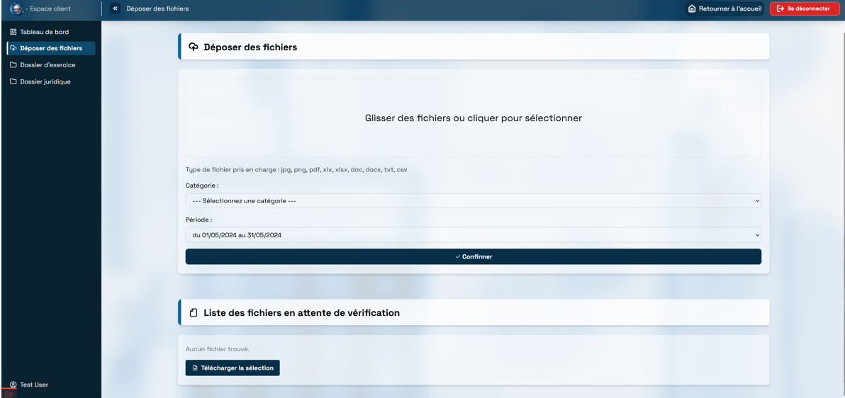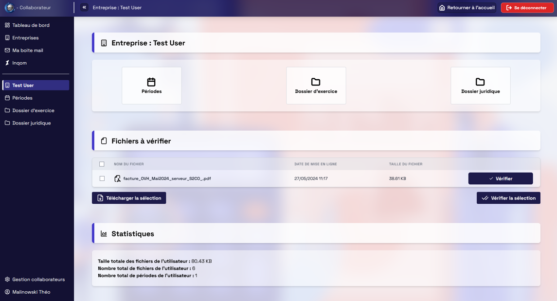 Dans le cadre d'un stage de deux mois, j'ai aidé à développer une solution web complète pour un cabinet de conseil et de comptabilité. La mission principale consistait à concevoir un espace client permettant le dépôt et la catégorisation simplifiée de documents comptables, avec un envoi automatisé vers le logiciel de production Inqom.