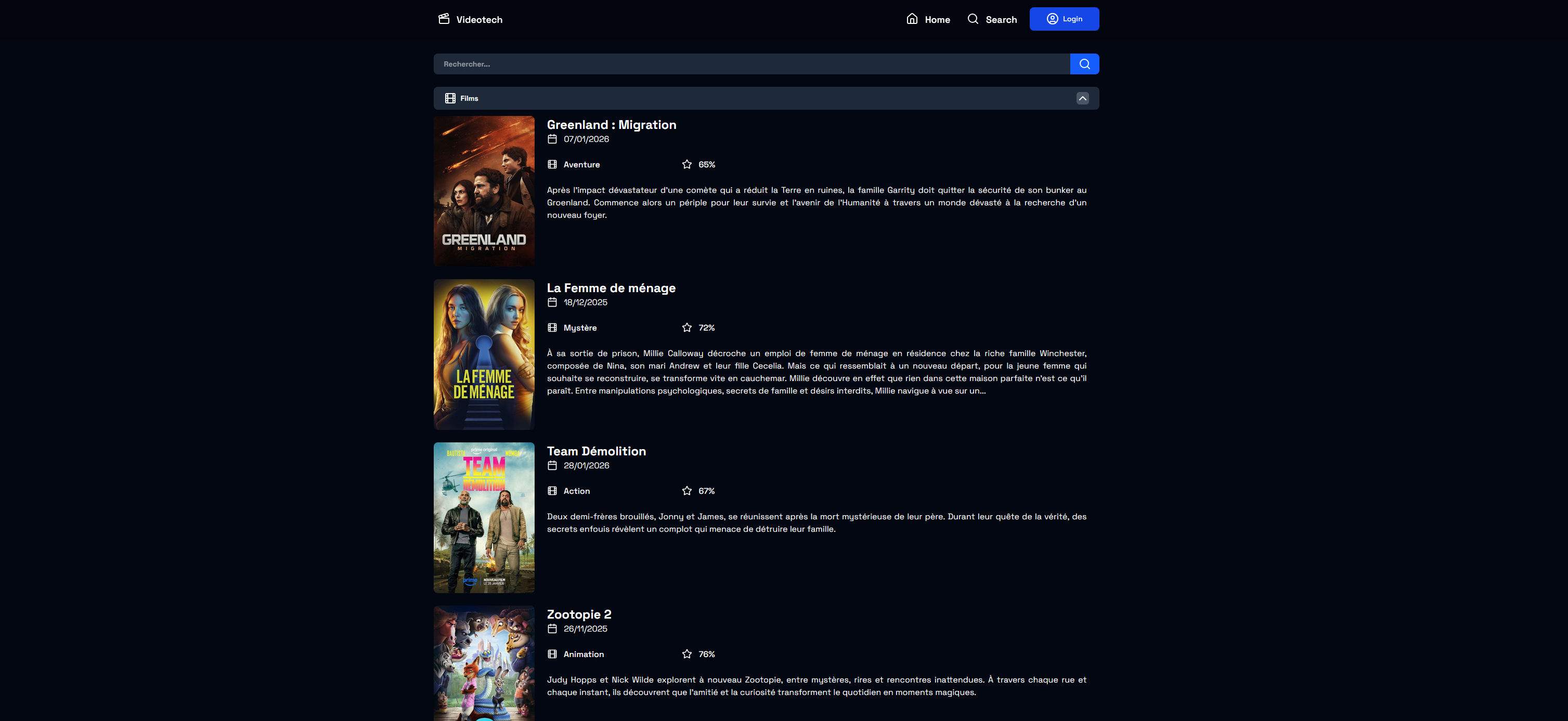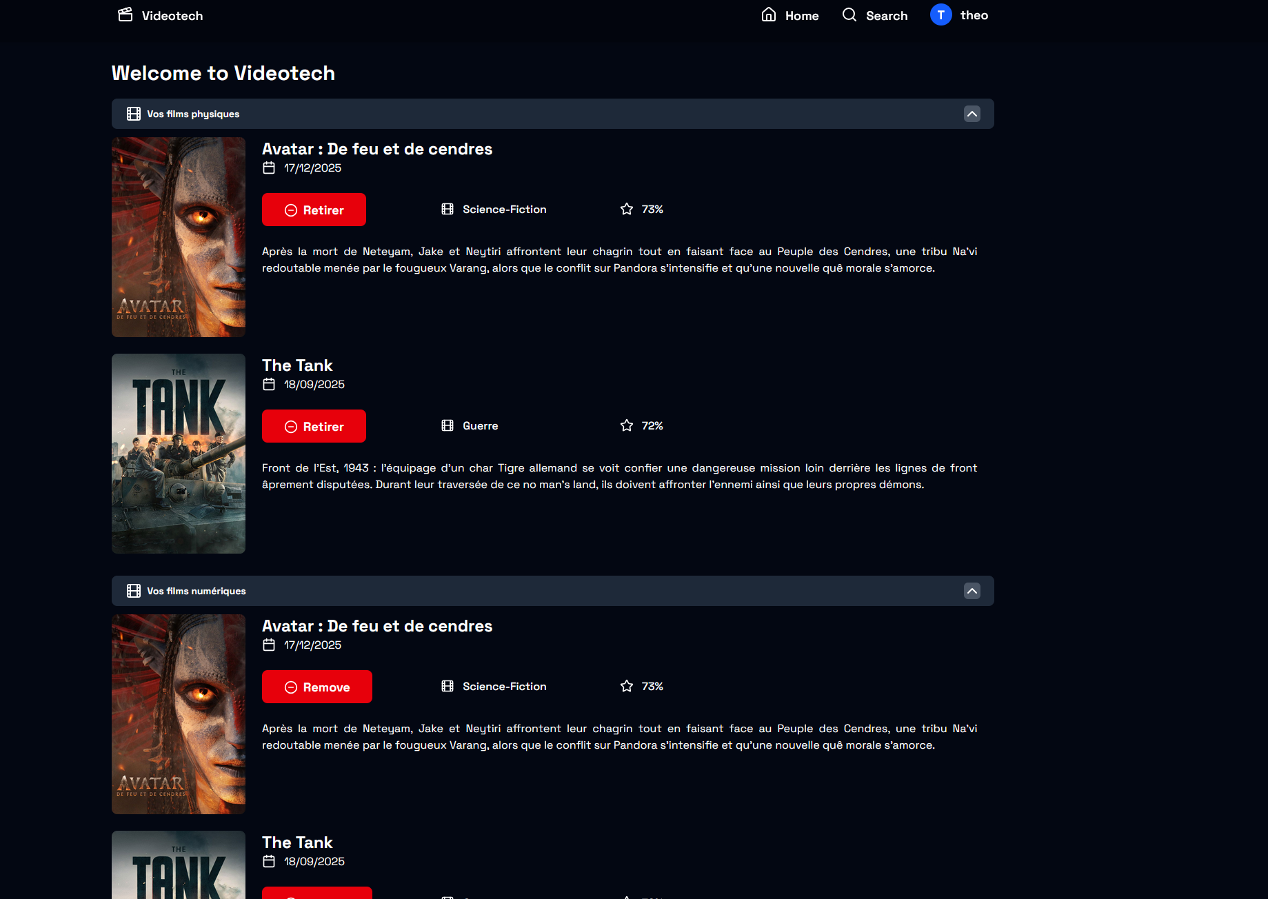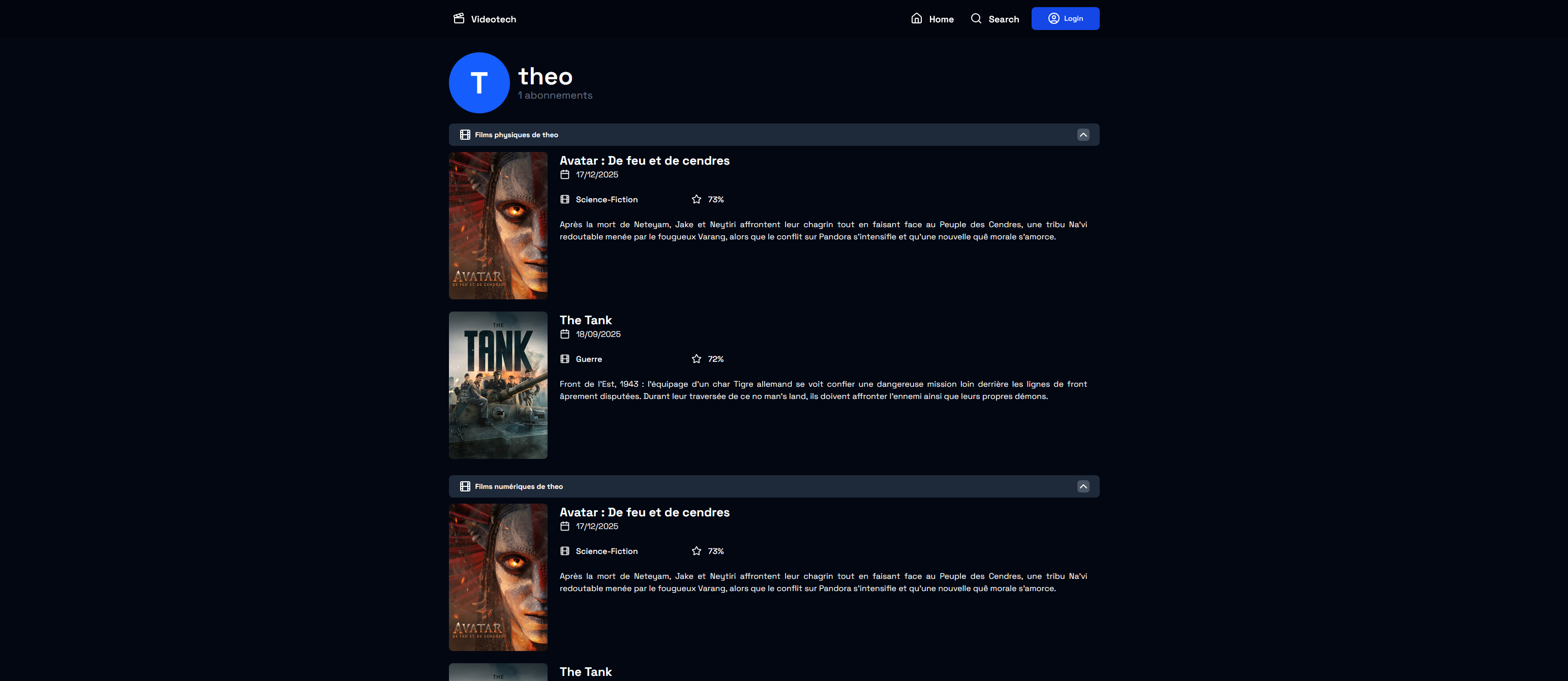 Mise en place d’une API REST avec Python/Flask pour gérer la vidéotech des utilisateurs. Une interface web (Tailwind) communique avec l’API pour permettre la recherche de films via l’API externe TMDb, l’ajout de films à sa vidéotech physique ou numérique, et la consultation des vidéotechs d’autres utilisateurs.